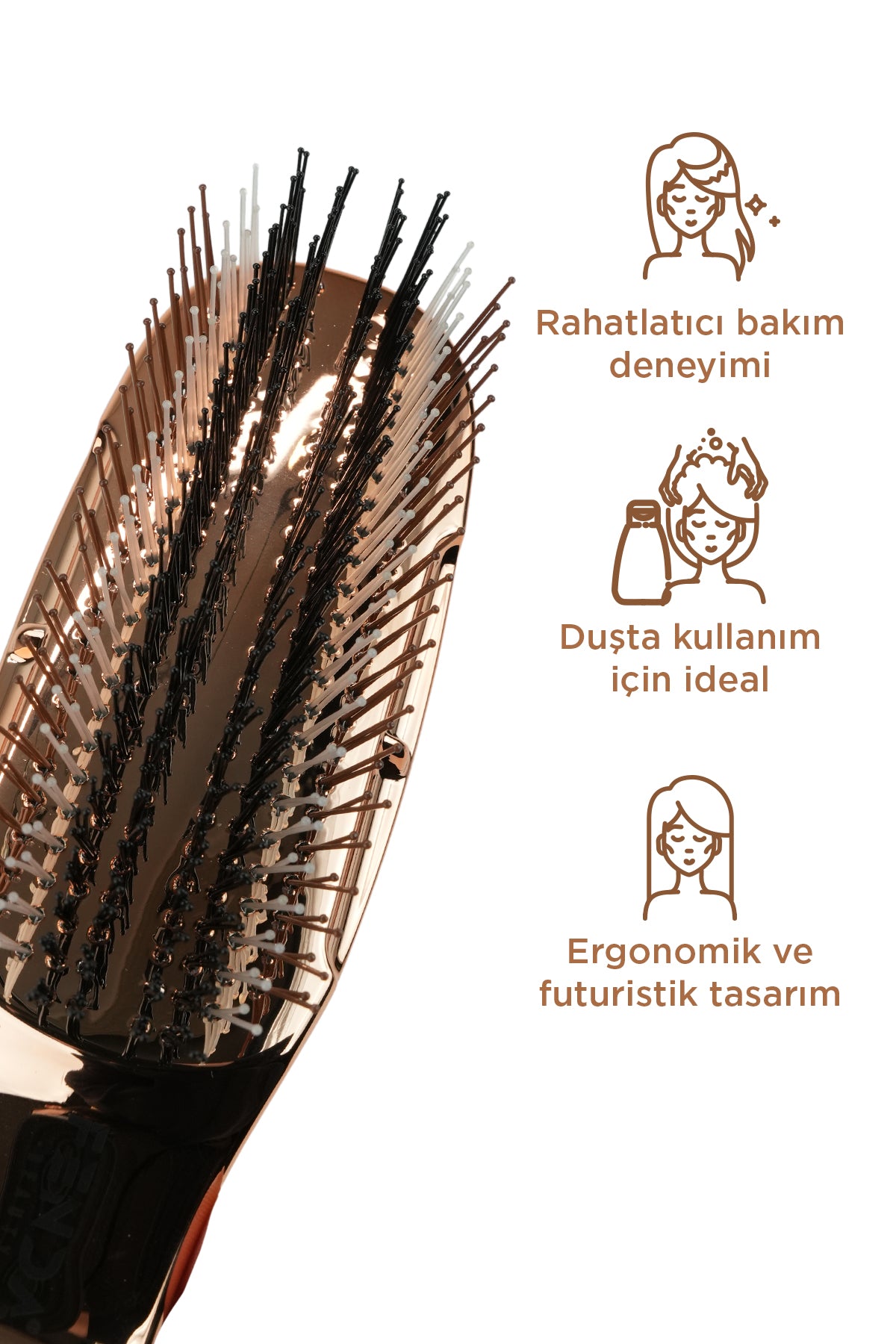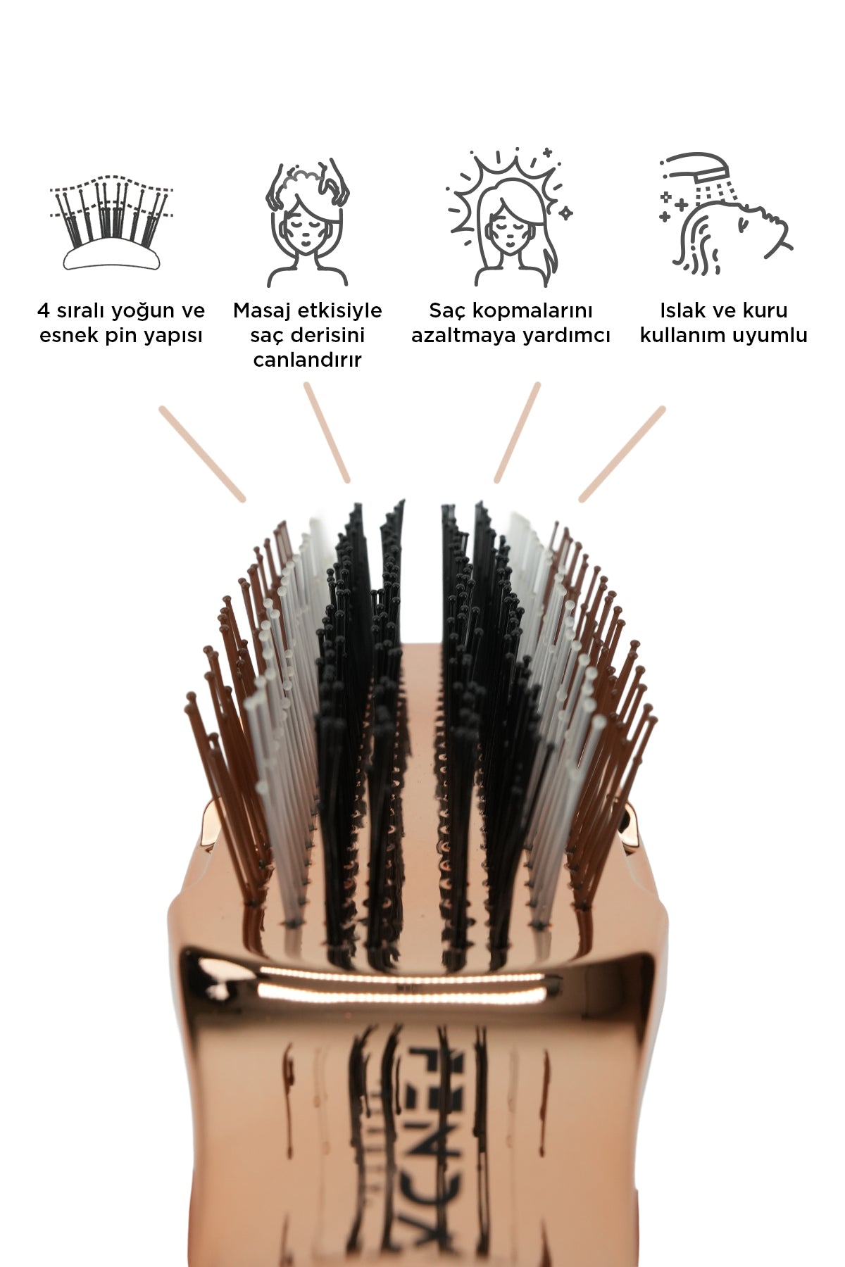 Farklı boyutlarda, sık ve yuvarlak uçlu pinler; saç derisine ve saç köklerine nazik masaj yaparak saç kopmalarını en aza indirmeye destek olur ve daha canlı, sağlıklı bir saç görünümüne katkı sağlar.